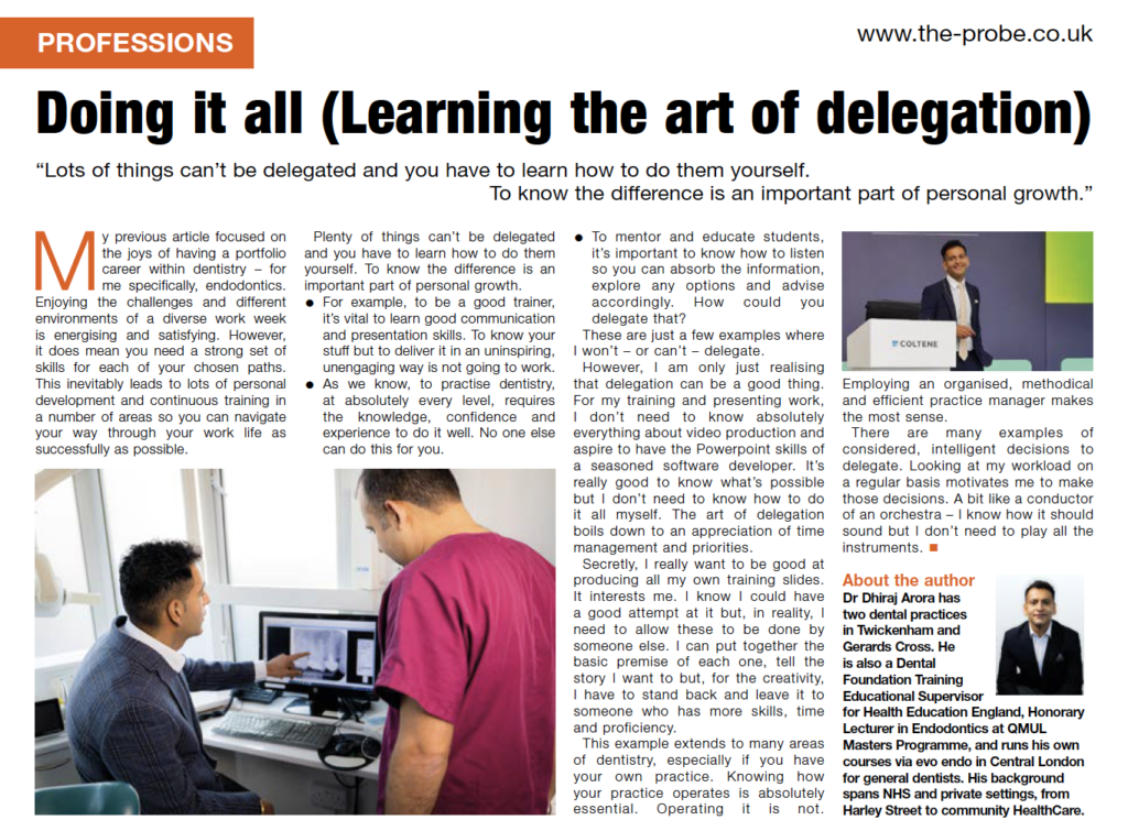 My previous article focused on the joys of having a portfolio career within dentistry – for me specifically, endodontics. Enjoying the challenges and different environments of a diverse work week is energising and satisfying. However it does mean you need a strong set of skills for each of your chosen paths. This inevitably leads to lots of personal development and continuous training in a number of areas – so you can navigate your way through your work life as successfully as possible.
