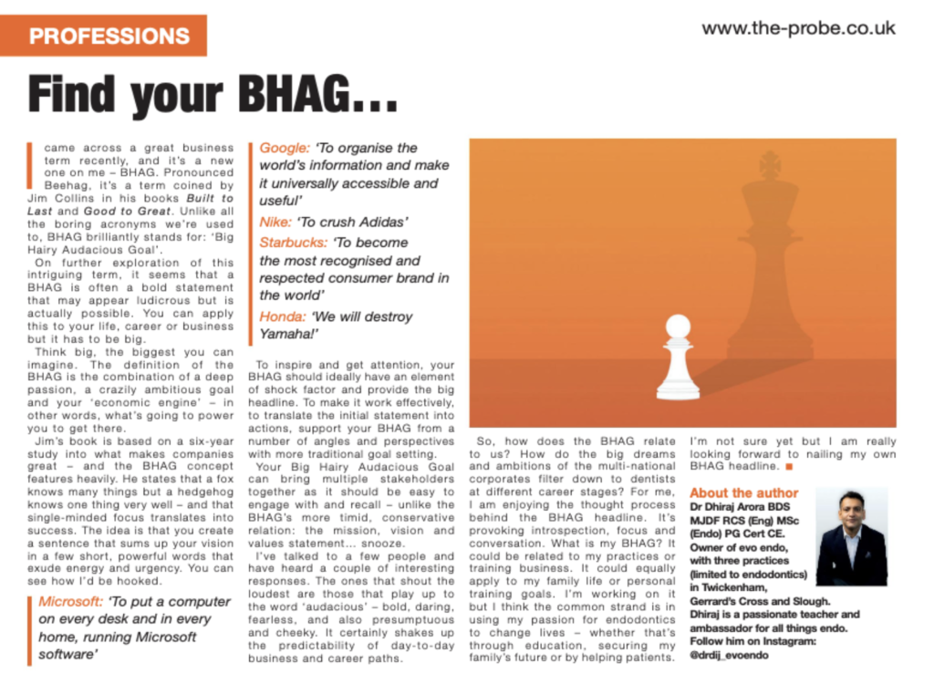 So how does the BHAG relate to us? How do the big dreams and ambitions of the multi-national corporates filter down to dentists at different career stages? For me, I am enjoying the thought process behind the BHAG headline. It’s provoking introspection, focus and conversation. What is my BHAG? It could be related to my practices or training business, it could apply to my family life or personal training goals. I’m working on it but I think the common strand is in using my passion for endodontics to change lives – whether that’s through education, securing my family’s future or by helping patients. I’m not sure yet but I am really looking forward to nailing my own BHAG headline.