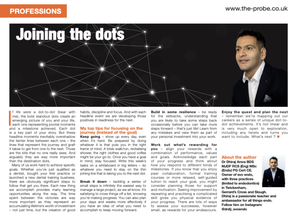 Many of us work hard to achieve specific goals. Whether you’ve just qualified as a dentist, bought your first practice or launched a new dental training business, there are obviously significant steps to follow that get you there. Each new thing we accomplish provides many learning opportunities along the way. The time spent between the victories are way more important as they represent an accumulating lifetime’s worth of investment – not just time, but the creation of good habits, discipline and focus. And with each headline event we are developing those positives in readiness for the next.