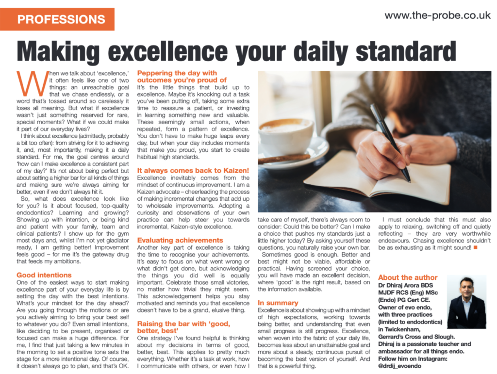 So, what does excellence look like for you? Is it about focused, top-quality endodontics? Learning and growing? Showing up with intention, or being kind and patient with your family, team and clinical patients? I show up for the gym most days and, whilst I’m not yet gladiator ready, I am getting better! Improvement feels good – for me it’s the gateway drug that feeds my ambitions.