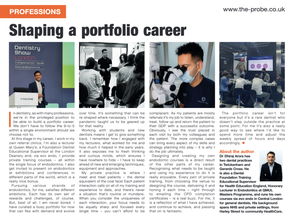Pursuing various strands of endodontics, for me, satisfies different ambitions. Each has its own set of rewards and challenges of course. But best of all I am never bored. I have curated a busy portfolio for now that can flex with demand and evolve over time. It’s something that can be re-shaped where necessary. I think the pandemic taught us to be geared up for that reality.