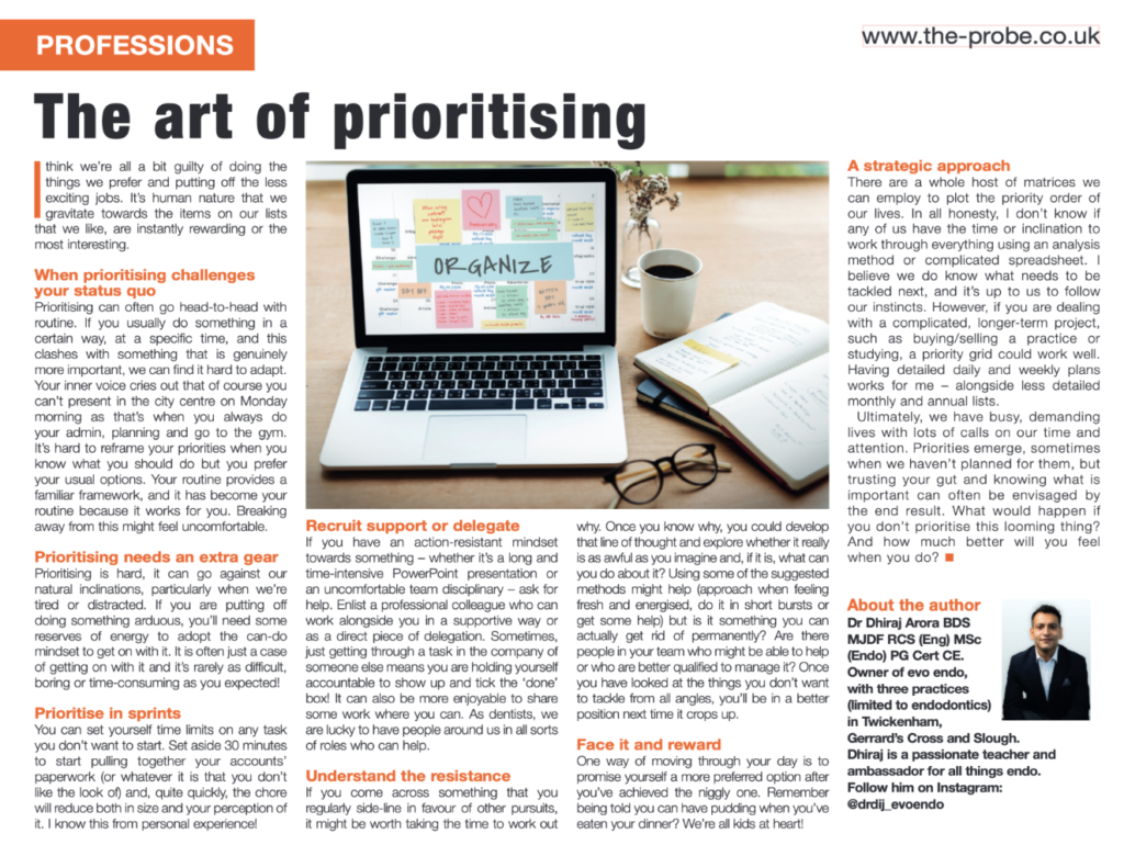 If you have an action-resistant mindset towards something – whether it’s a long and time-intensive Powerpoint presentation or an uncomfortable team disciplinary – ask for help. Enlist a professional colleague who can work alongside you in a supportive way or as a direct piece of delegation. Sometimes just getting through a task in the company of someone else means you are holding yourself accountable to show up and tick the ‘done’ box! It can also be more enjoyable to share some work where you can. As dentists we are lucky to have people around us in all sorts of roles who can help.