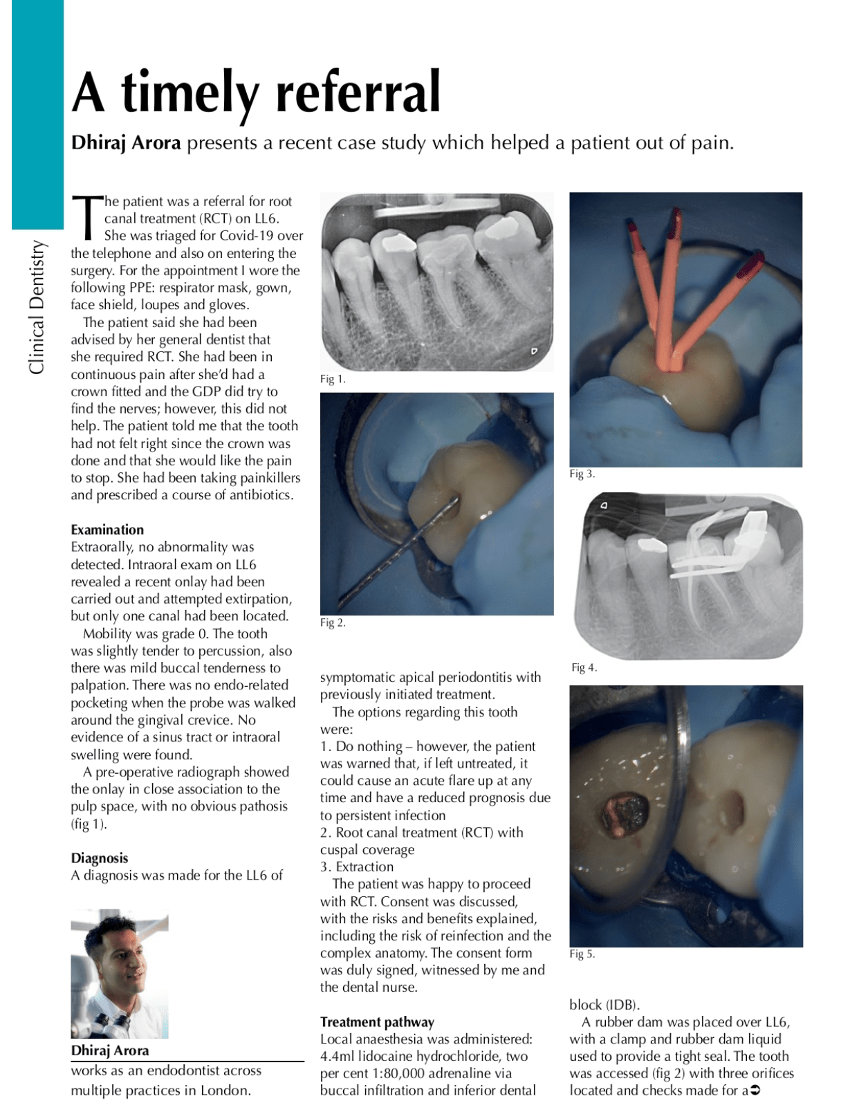 Read “A timely referral” in The Dentist (issue May 2021) featuring one of Dhiraj’s case studies. Dhiraj helped a patient who was in constant pain following a crown. He helped her to consider her options and agree to root canal treatment for a successful outcome.
